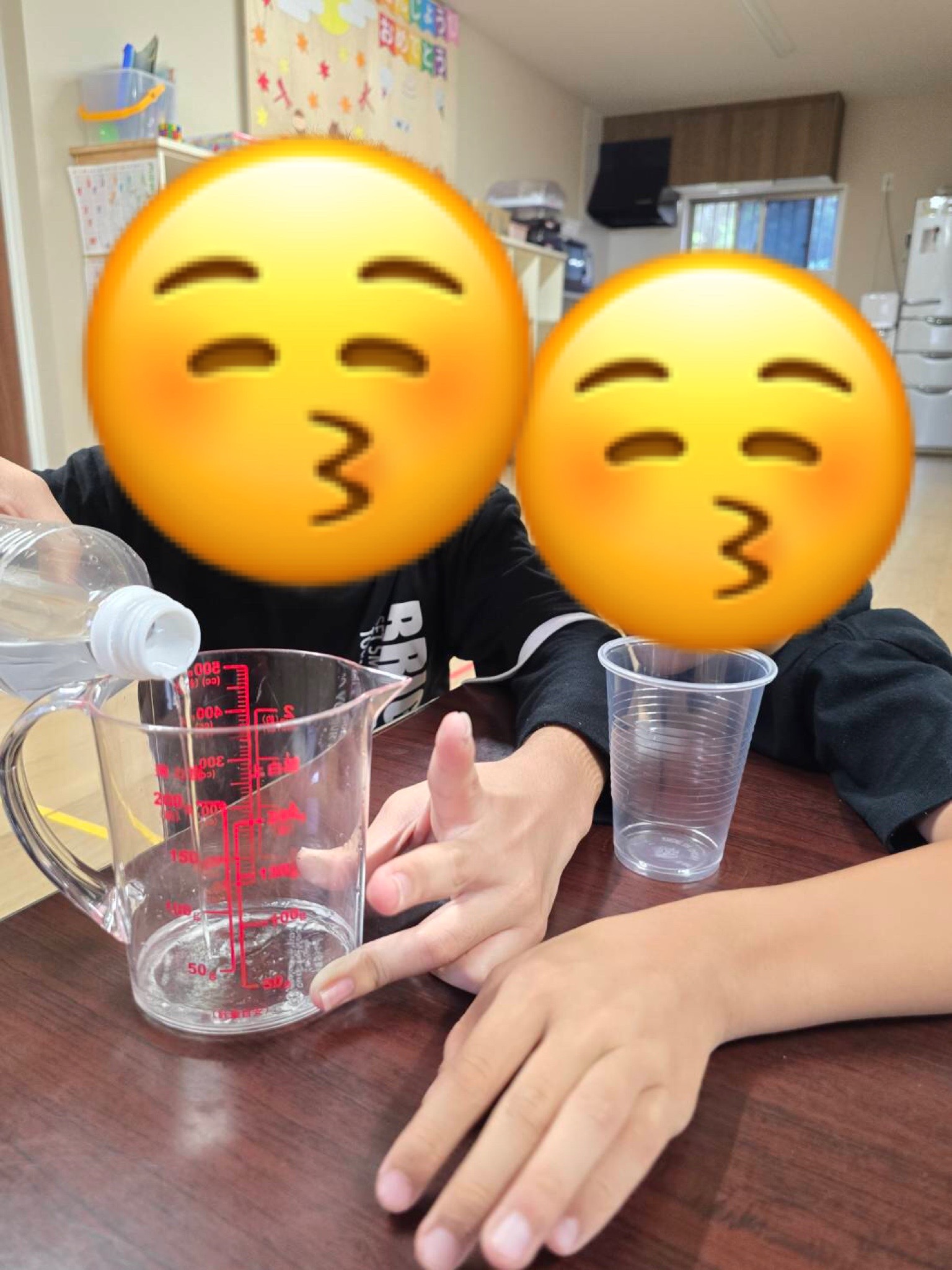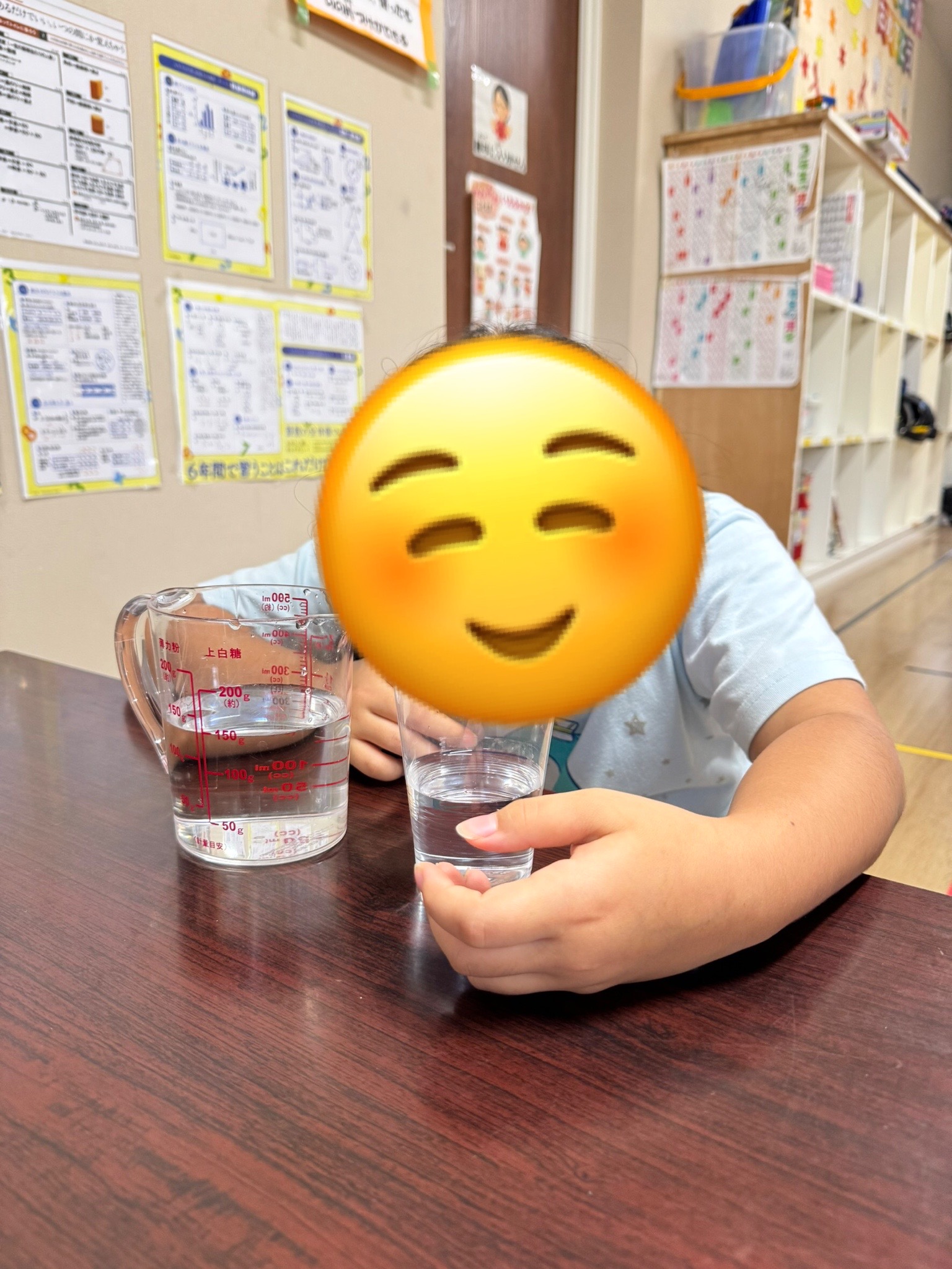 ①まず始めに、計量カップに水を100ml測ってコップに入れいました。