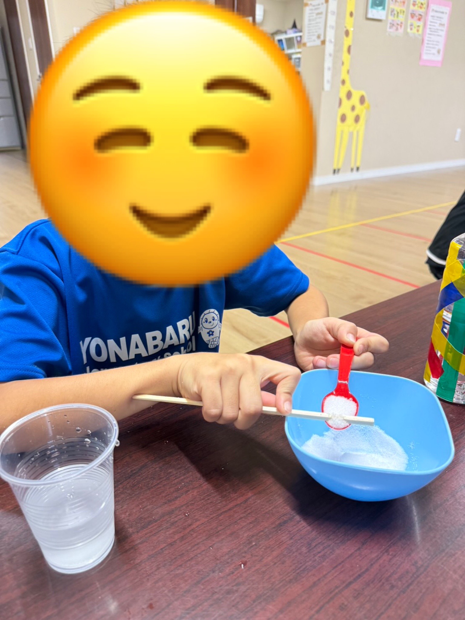 ④PVA洗濯のり25mlをコップに入れ、割り箸を使って混ぜています。