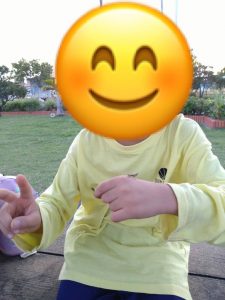 バッタを見付けて満面の笑みを浮かべる子