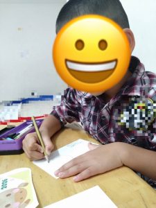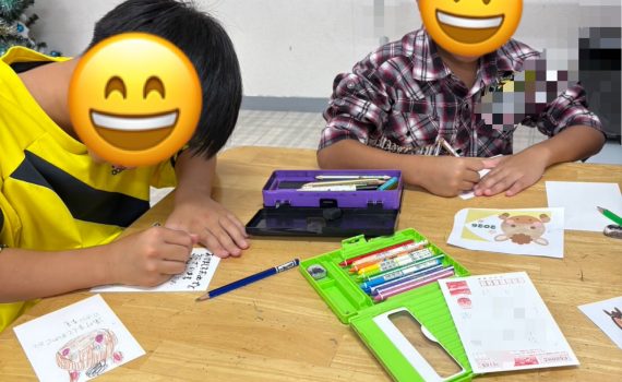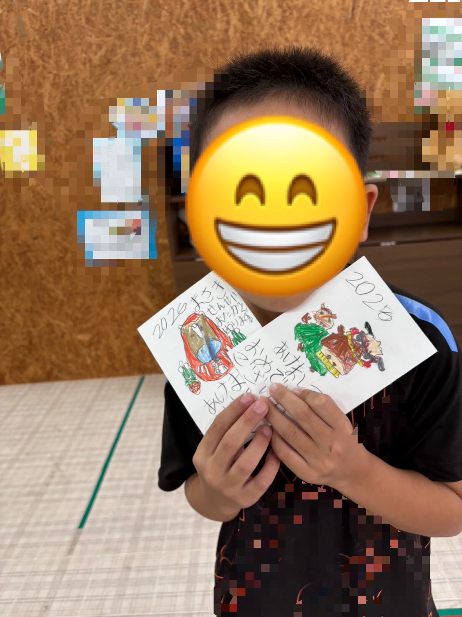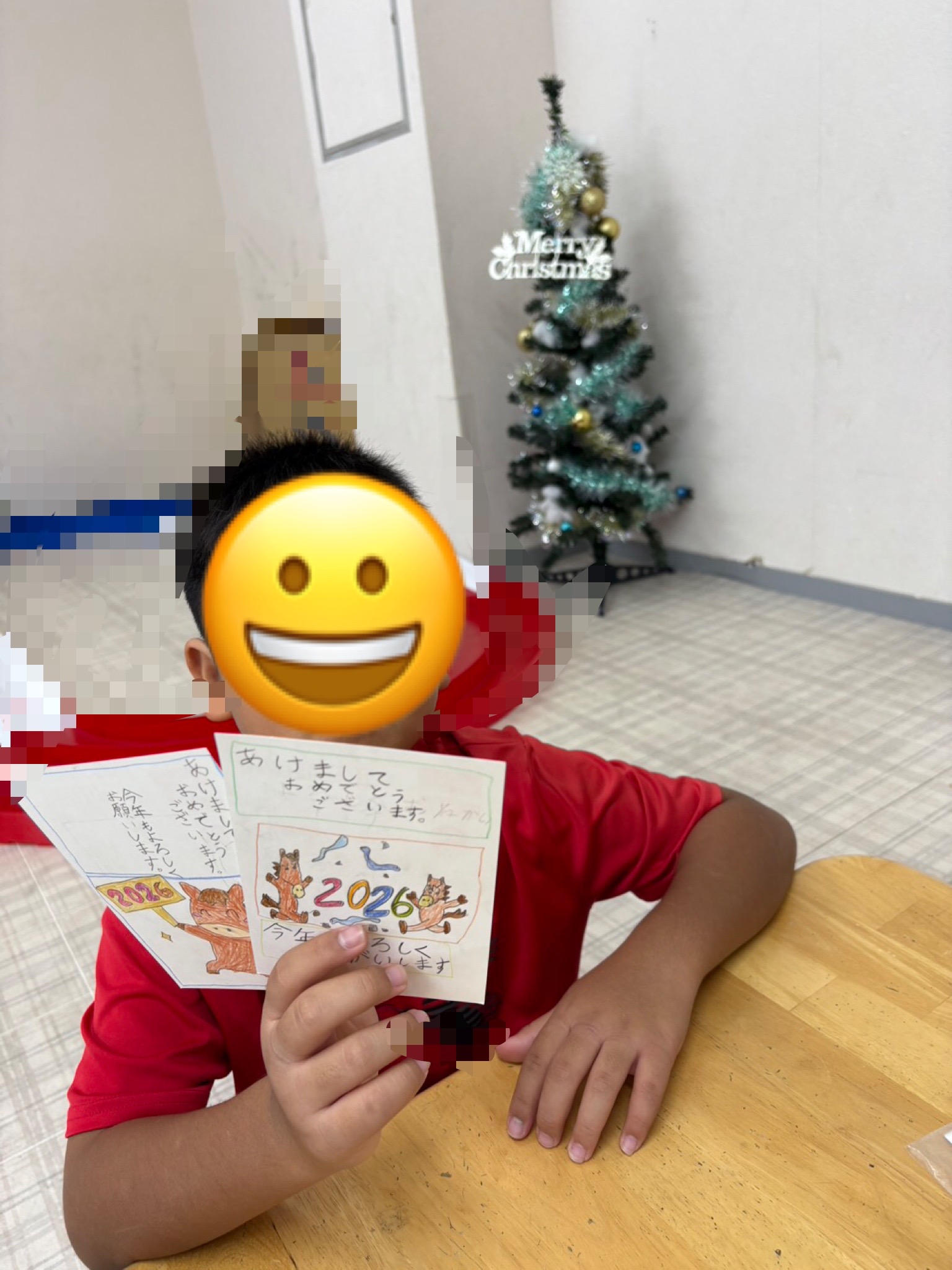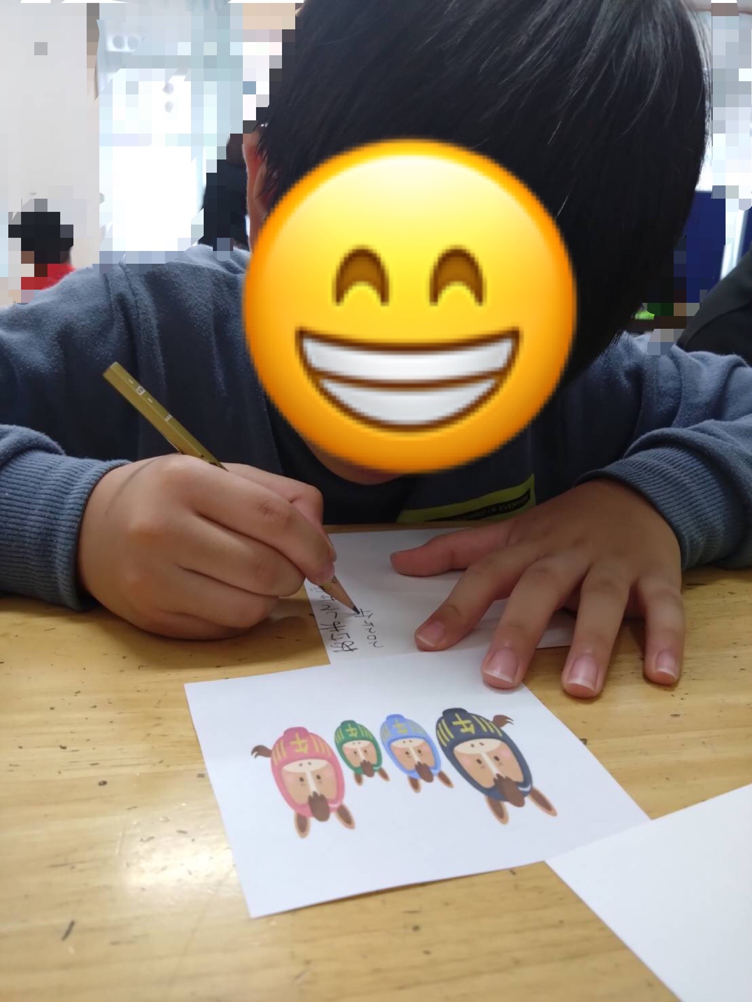 年賀状作りでは、ハガキの書き方、新年のあいさつや感謝の気持ちを伝える事の大切さを知る事をねらいとしています。2日間年賀状作りを行いました。ハガキの裏面に来年の干支の馬のイラストや挨拶・感謝の気持ちを書きました。