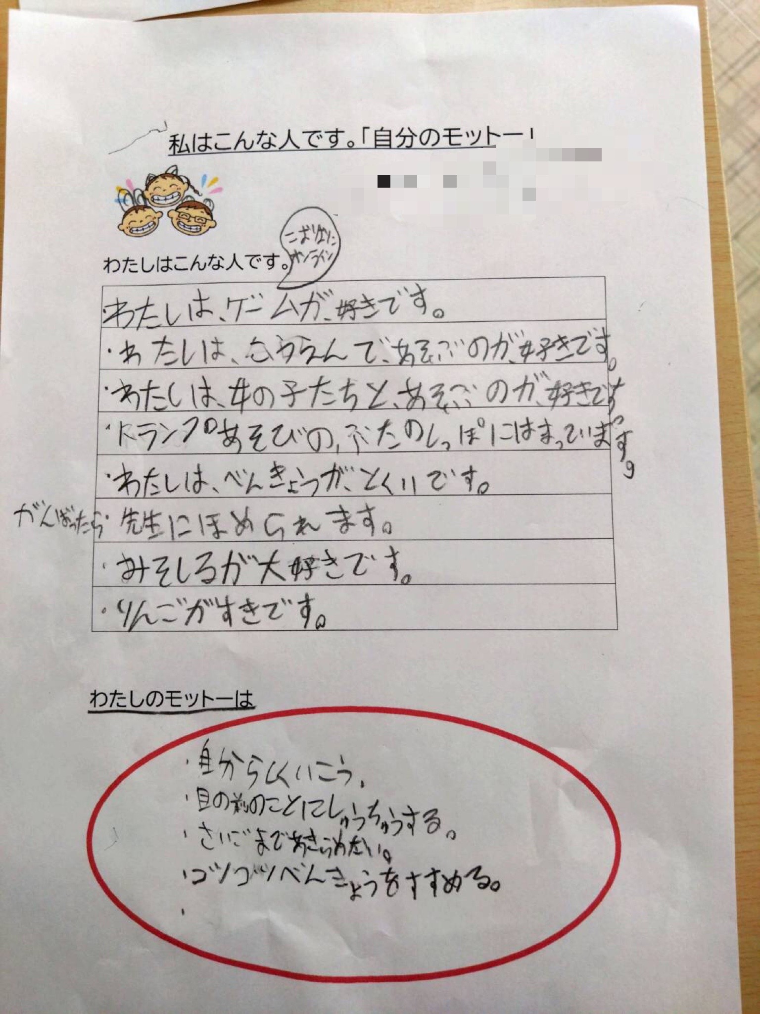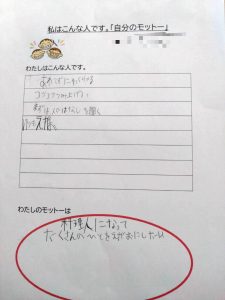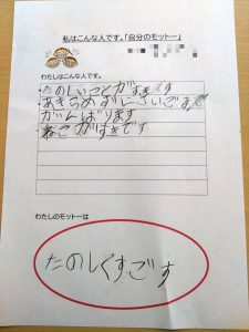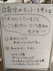 今日の活動は、SSTで「自己理解・自分のモットー」を考えました。自分のモットーを考えるねらいとして、自分を理解してより良い行動を選べる力(自己理解・自己調整)を育てること、周囲との関わりを円滑にし自信を持って生活する力を育むことです。