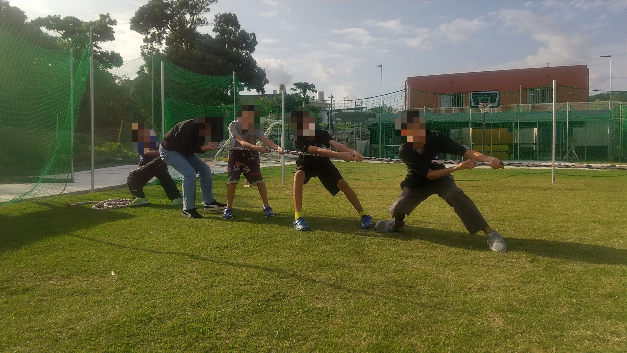 広場では、活動始めに教わった「綱引き必勝法」を思い出しながら、男性スタッフVS児童で対戦しています🔥