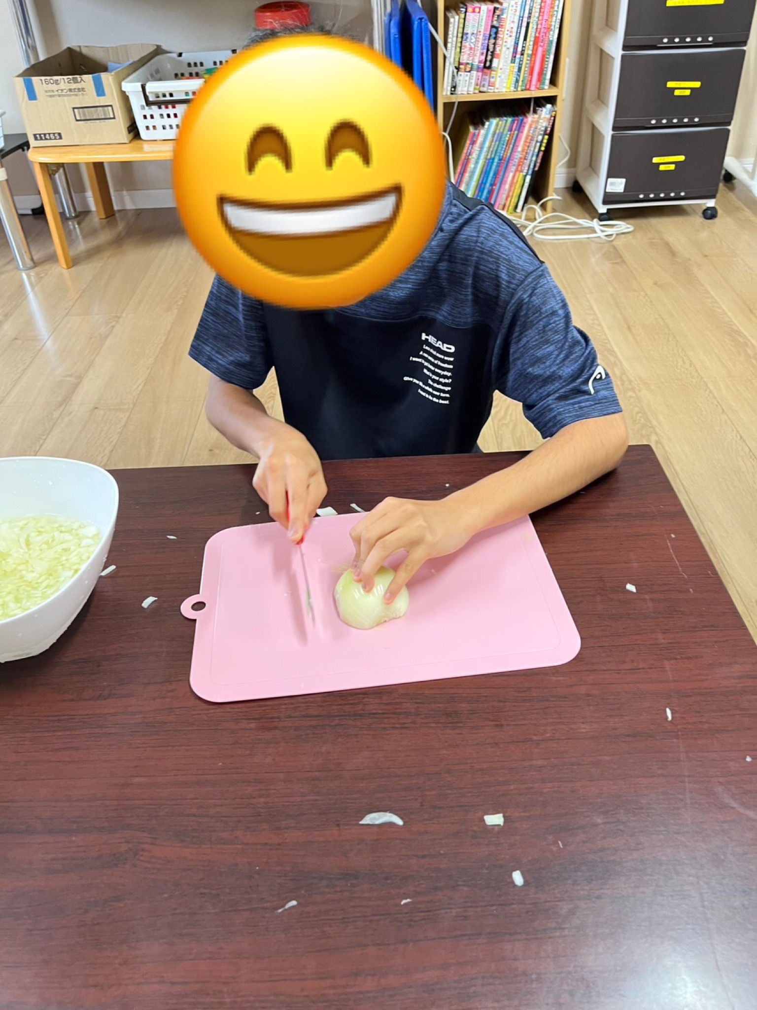 タマネギの🧅むきかたを年下児童に教えています😍