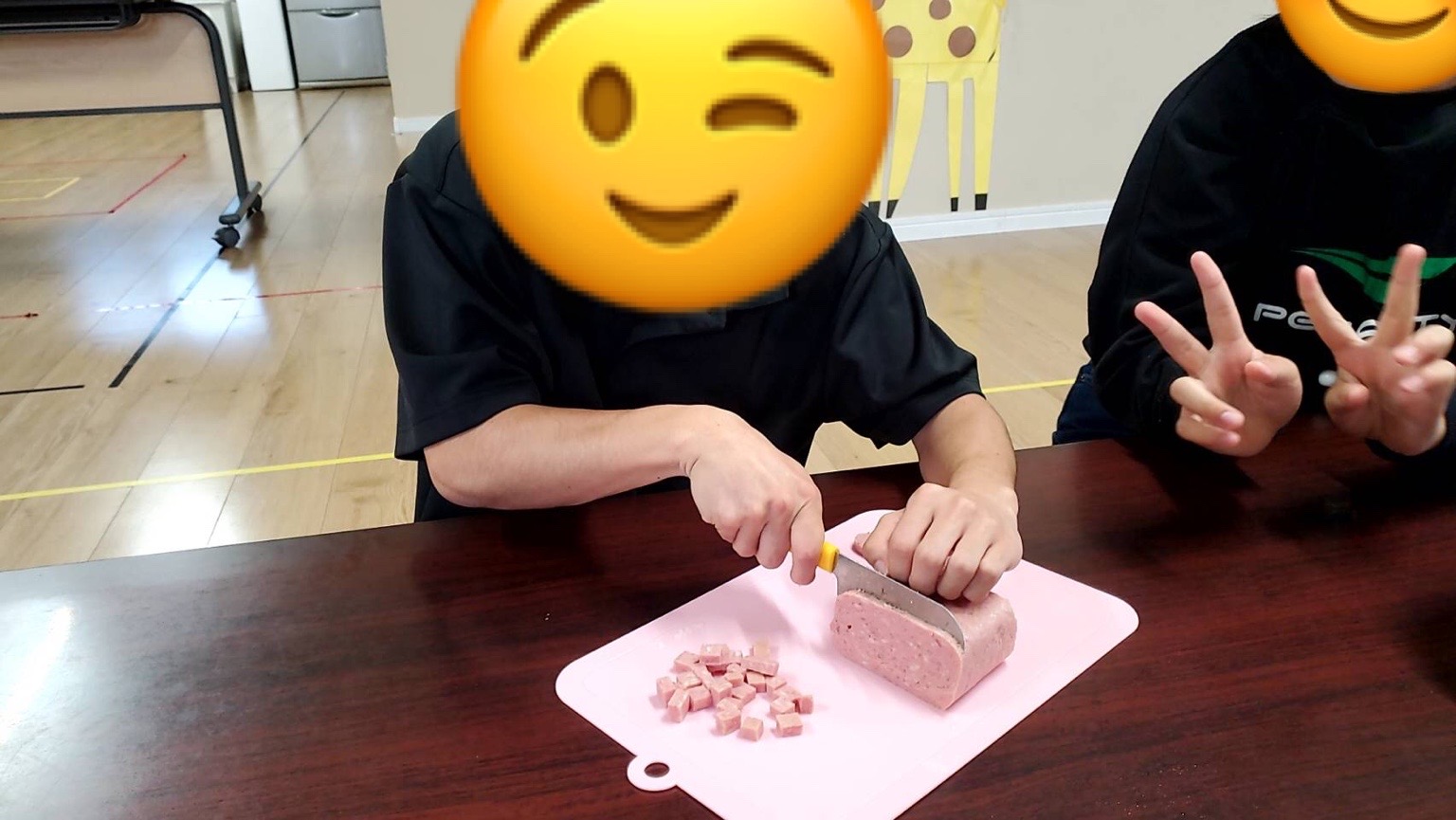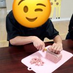 職員と一緒に包丁を使って切ります。