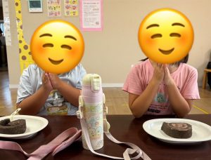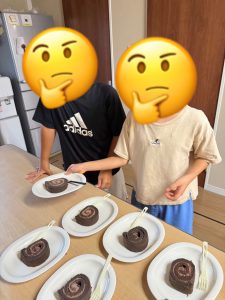 お友達と座ってロールケーキを美味しそうに食べていました😊