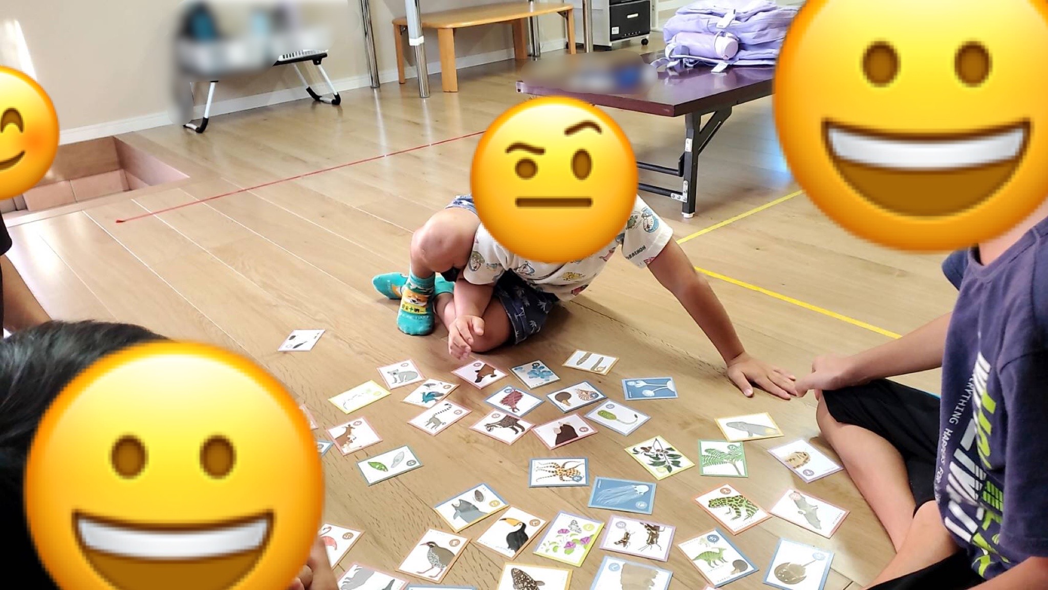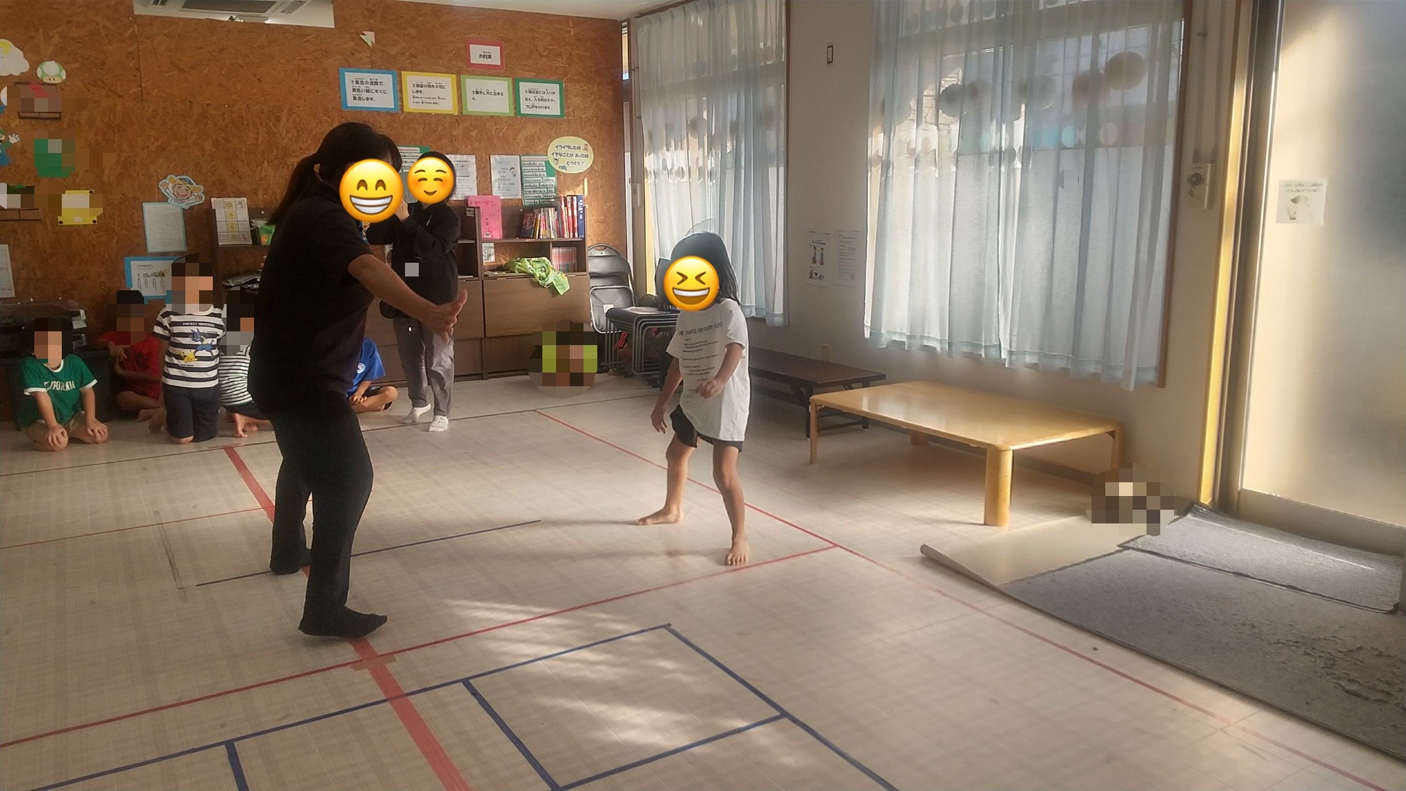 活動中はみんな「きゃー きゃー」と言いながら川を渡ったり、タッチされずに渡れたら「よっしゃ💪‼️」と喜んだり、お友達を渡らせる為に自分がおとりになってピラニアさんを引き付けている間に他のお友達を渡らせてあげる子も🤩🥰