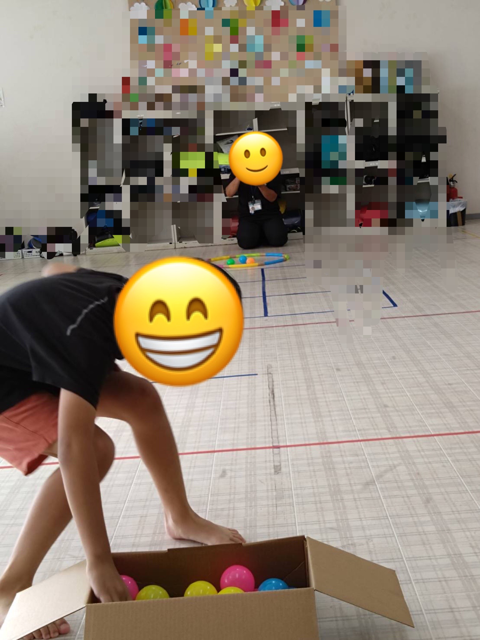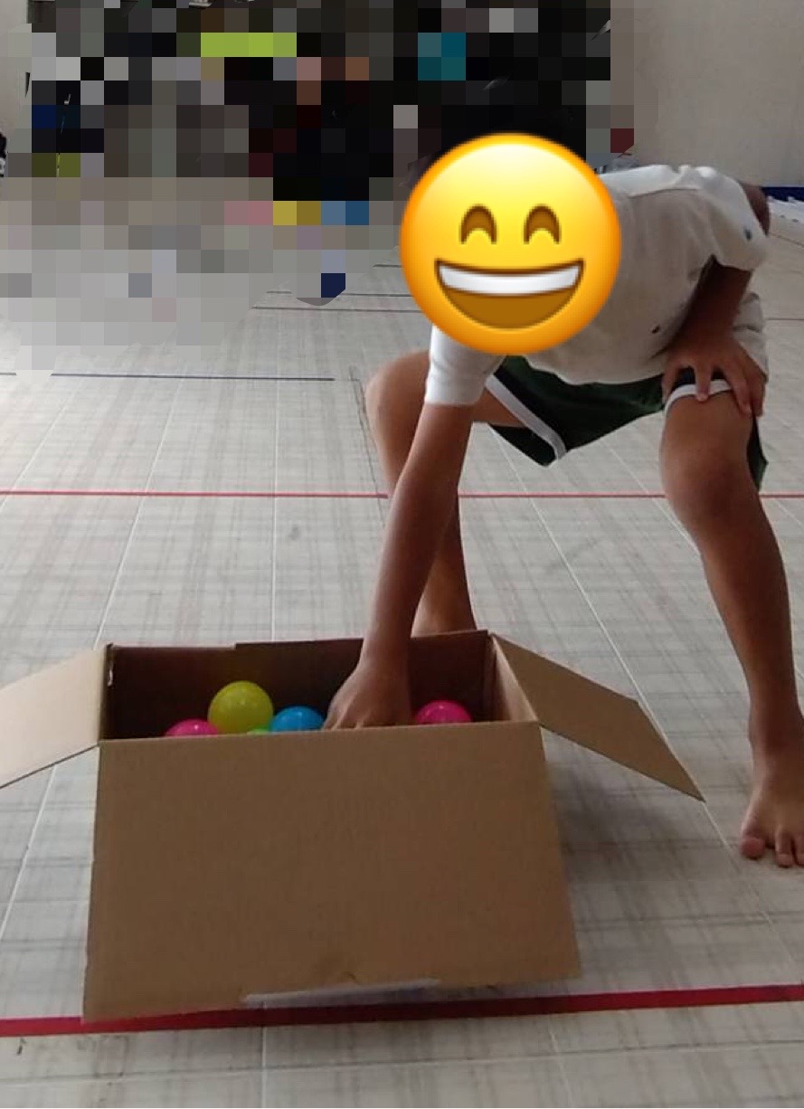今回は、「ボール集めゲーム」を行いました。初めに、「ボーツを持つのは1個だけ。20秒間の時間設定がある事。応援をする。負けても怒らない」等のゲームの説明とルールの確認を全員で行ってから、ゲーム開始です♪
