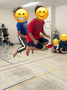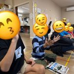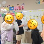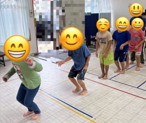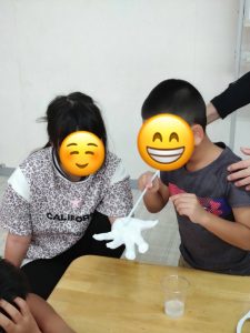 説明を聞いた後は、3人1グループになってみんなの前に出て、シャボン玉液を作る係り、ストローでシャボン玉を吹く係り、軍手をはめてシャボン玉を手で受けとる係りを決めて、シャボン玉を手にのせられるか挑戦しています🔥