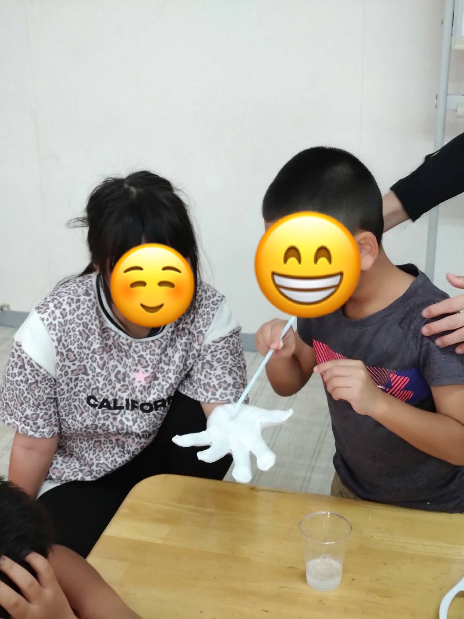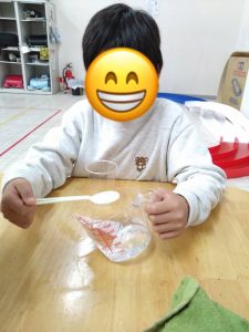 自分達で役割を決め、協力してシャボン玉を作り手にのせることができると、🗣️「オッ! できた!😲」🗣️「すごーい!😆」との声が各グループからたくさん聞こえてきて、それと同時に実験が成功して喜ぶ子供達の嬉しそうな表情もたくさん見られています✨